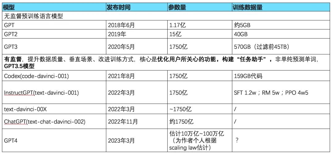 GPT版本历史如上图所示。注意GPT3以前都是无监督训练。GPT3只支持文本,GPT4(Generative Pre-trained Transformer 4)是一个大规模的多模态模型,可以接受图像和文本输入,产生文本输出,输出任务依旧是一个自回归的单词预测任务。这与外界之前的预期略微不同,预期中GPT-4多模态会增加语音、图像、视频、文本多模态输入,输出可能也不局限于文字。
