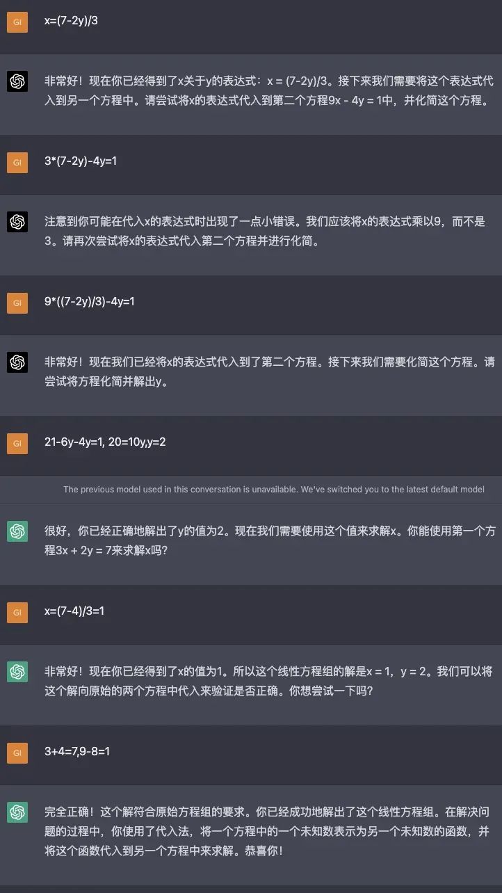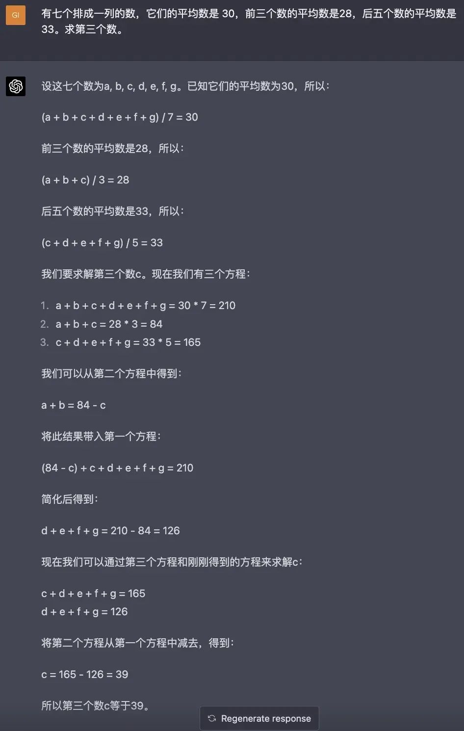 评论:小学奥数题目信手拈来,不过第一次回答的有点问题,点击“Regenrate response”按纽后生成了完美的答案。