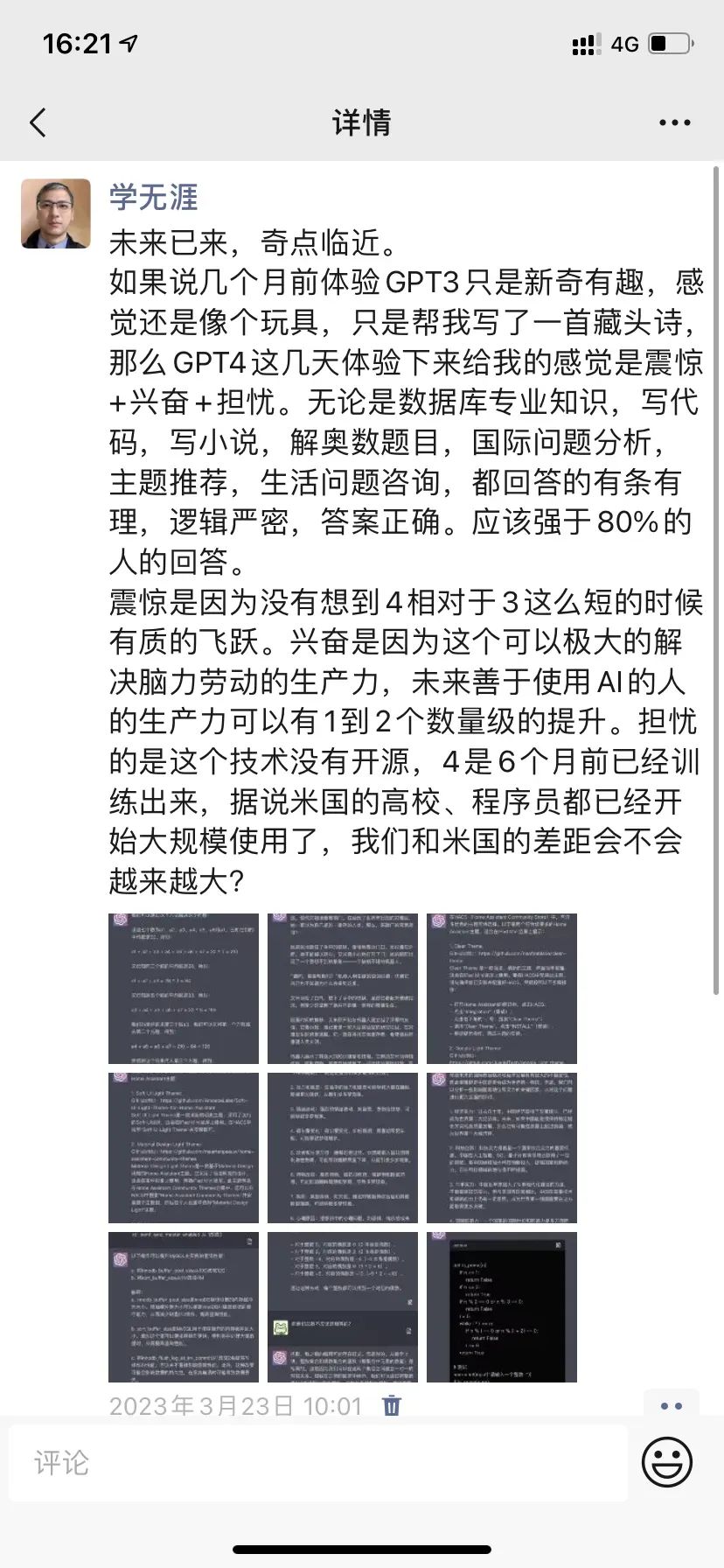 直到3月23号体验到了GPT4,我震惊了,我的朋友圈原文: