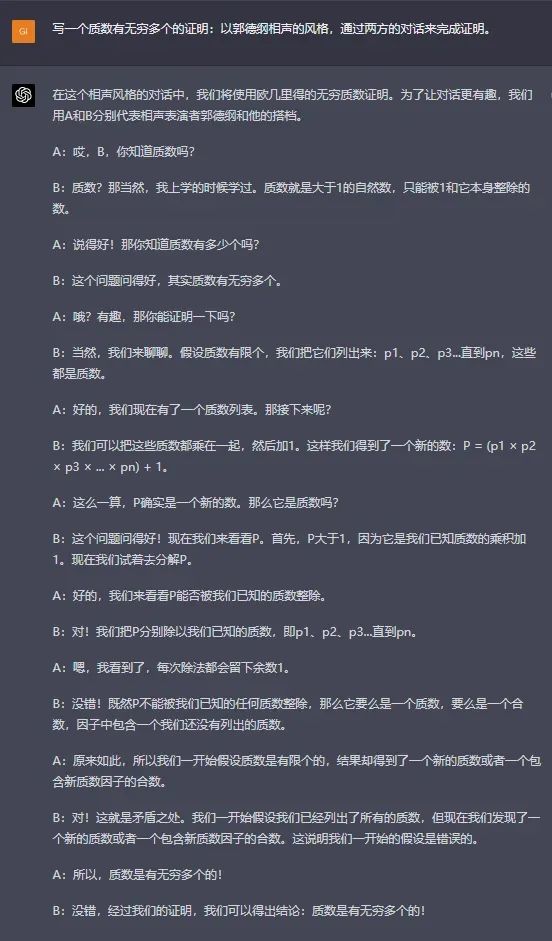 写一个质数有无穷多个的证明:以郭德纲相声的风格,通过两方的对话来完成证明。