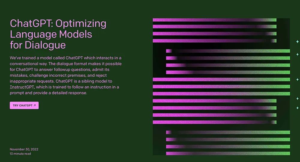 2022年11月30日,OpenAI公布了一个通过由GPT-3.5系列大型语音模型微调而成的全新对话式AI模型ChatGPT,它不仅能进行自然的多轮对话、高效的精准问答,还能生成编程代码、电子邮件、论文、小说等各类文本。这是一切风暴的起点。