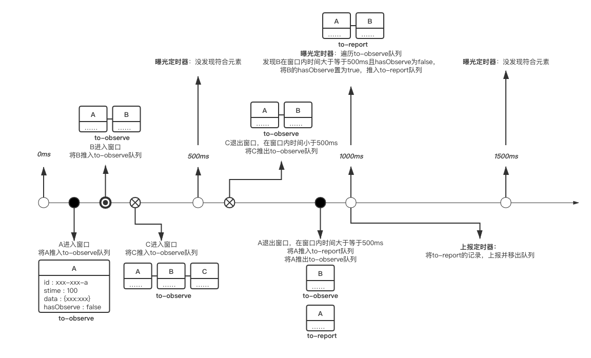 // 1、从to-observe队列获取X的stime,如果(当前时间-stime)>=500ms而且hasObserve为false,将X元素的数据推入to-report的队列。