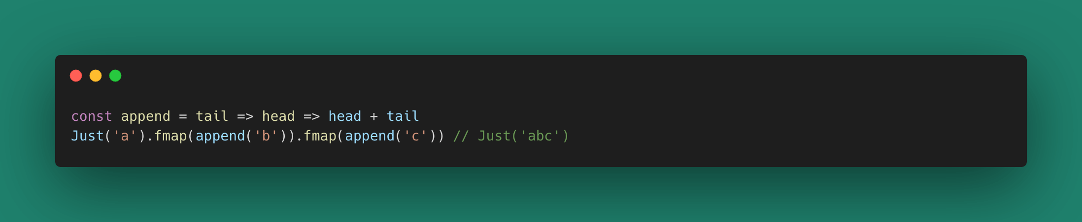 一旦数据类型被我们锁定在了 Monad 空间(范畴),那我们就可以在这个范畴内连续调用 fmap(或者其他这个空间的函数)来进行值操作,这样我们就可以链式处理我们的数据。
