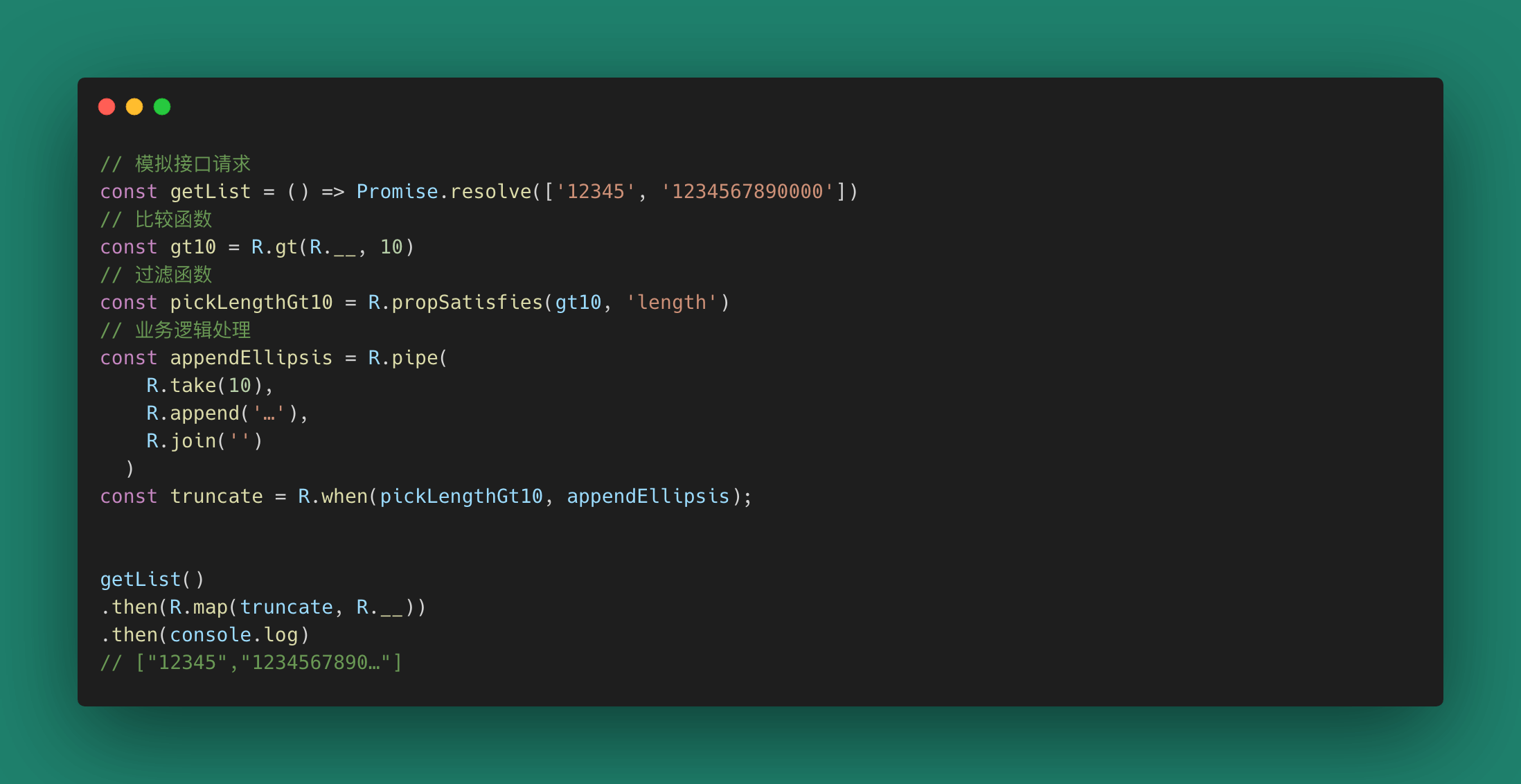 这个也是常见的前端场景,当文本长度大于X时,显示省略号,这个实现使用 Ramdajs 。这个过程中你就像是在搭积木,很容易就把业务给“搭建”完成了。
