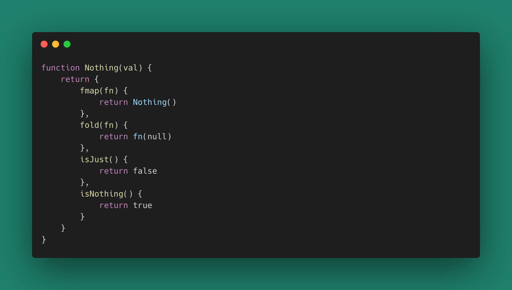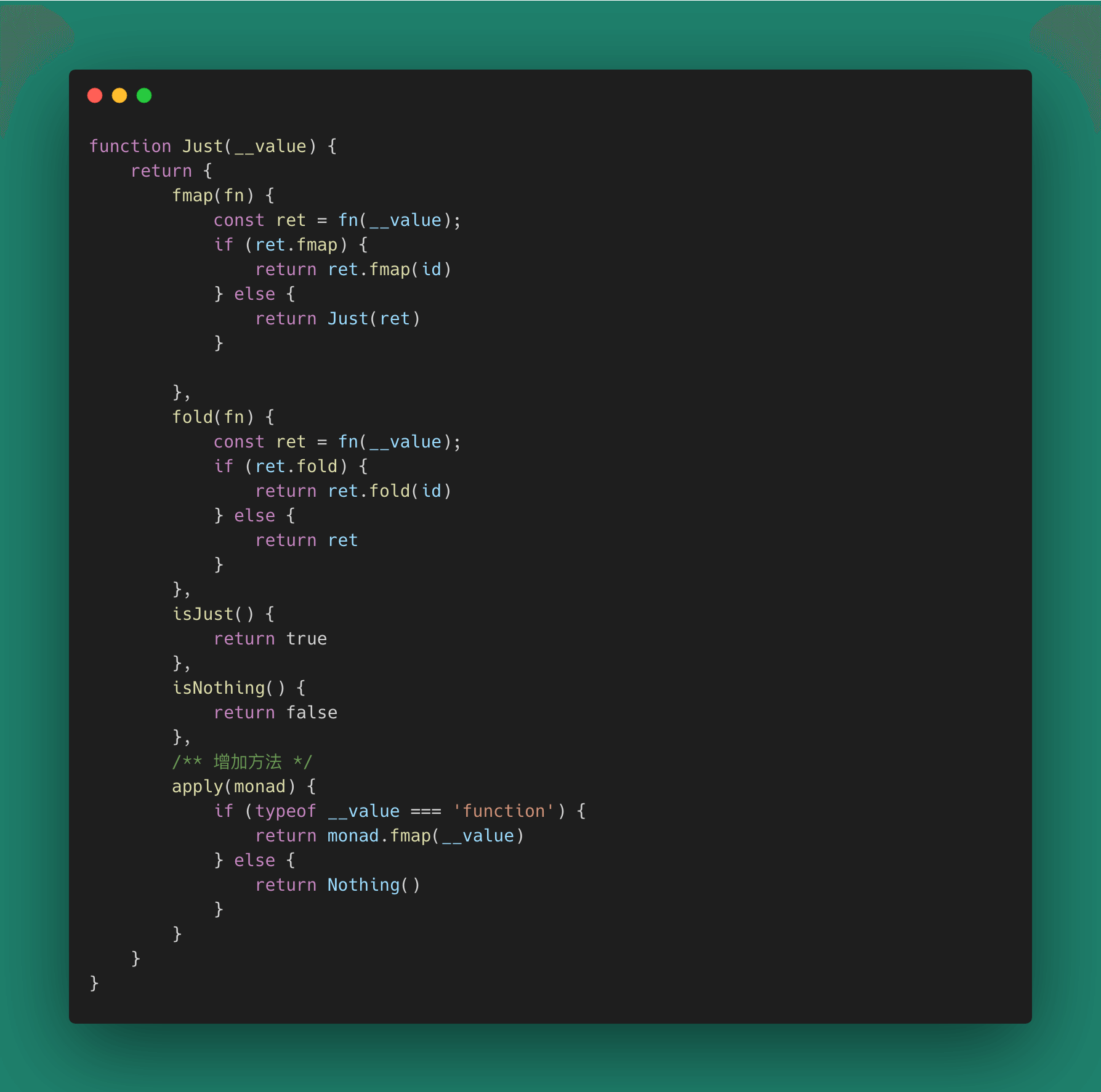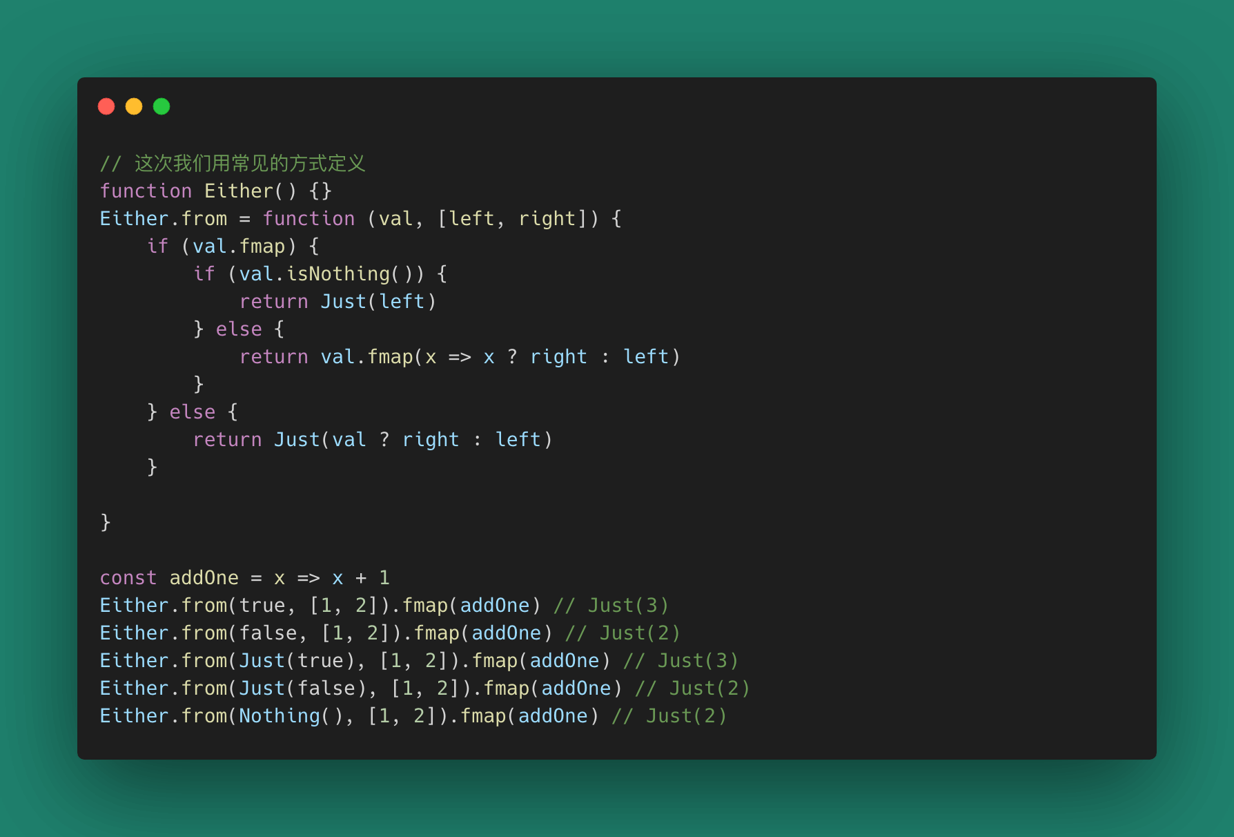 我们在Monad空间中消除了烦人的!== null判断,甚至消除了三元运算符。一切都只有函数。实际使用中一个 Maybe要么是Just要么是Nothing。因此,这里用**Maybe(..)**构造可能让我们难以理解。