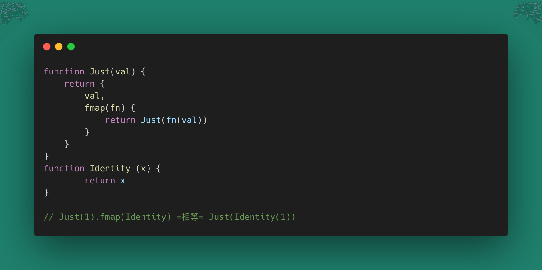 很多函数式编程里面都会实现一个Identity函数,实际就是一个幺元素。比如 JavaScript 中对 Just 满足二元结合律可以这么操作:
