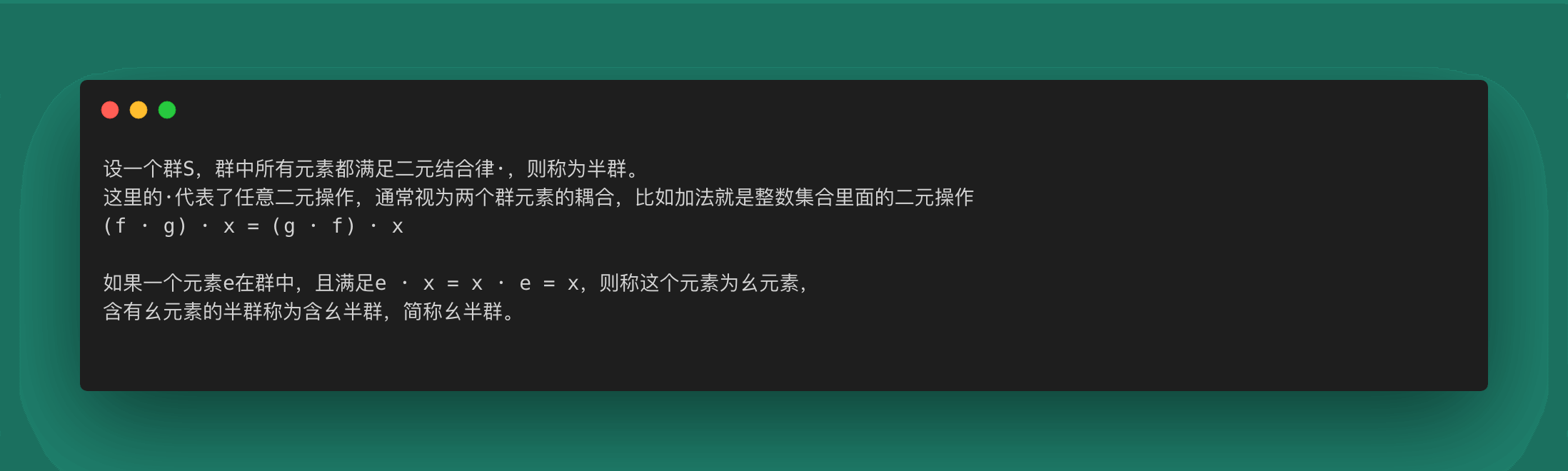 另外一个理解群的概念就是自然数(构成一个群)和加法(群的二元运算,且满足结合律,半群)。