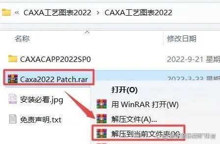 9.返回之前解压的“CAXA工艺图表2020”文件夹,选中“Caxa2022 Patch.rar”文件,鼠标右键点击“解压到当前文件夹”