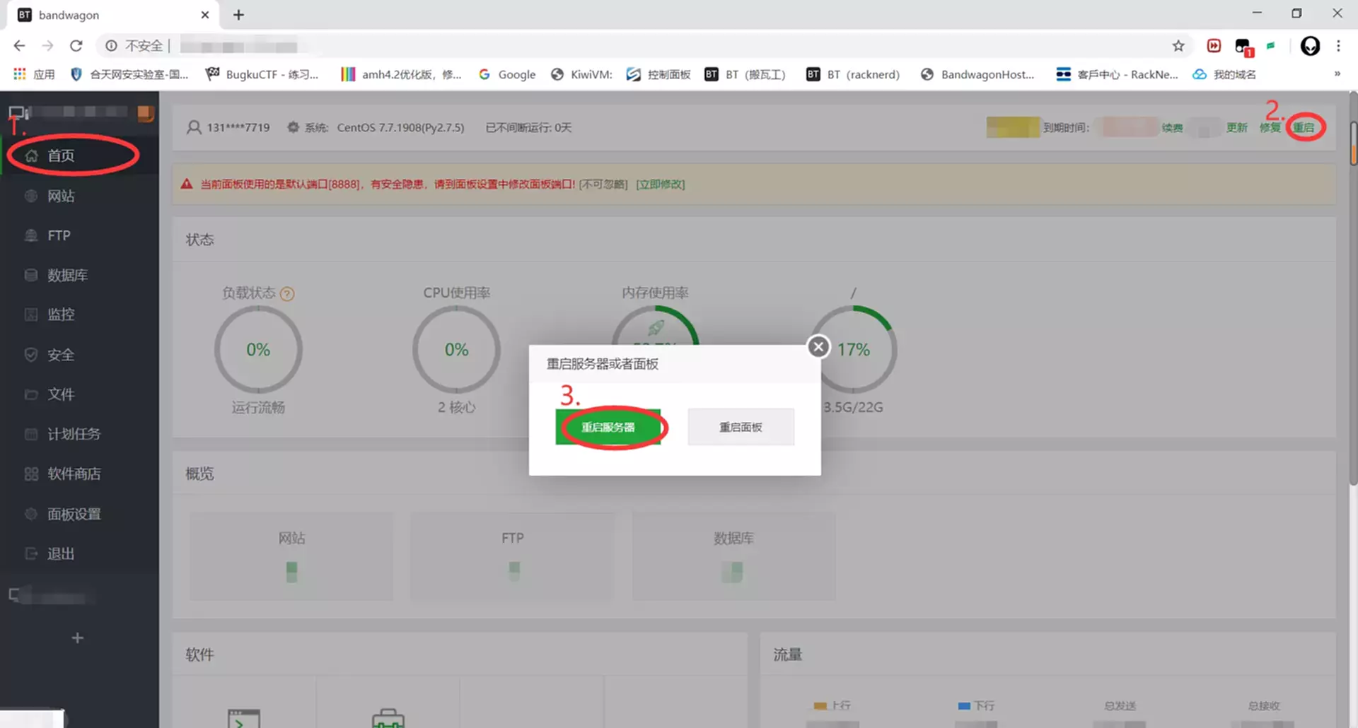 5 .最后返回首页,单击重新启动,选择重新启动服务器