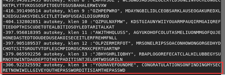 可以看到当key长度为14时,得到key可读为youhavefoundme,看一下后面的明文,在最后写到