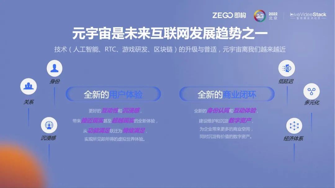 即构认同元宇宙是未来的互联网发展趋势之一。随着人工智能、RTC、游戏研发、区块链的升级与普适,元宇宙离我们越来越近,我们也相信元宇宙可以带来全新的用户体验和商业闭环,以及更好的互动性和沉浸感,带来接近现实甚至超越现实的全新体验,从功能满足跃迁为情绪满足,实现所见即所得的虚拟世界体验。除此之外,还会带来全新的身份认同和互动体验建设,维护和沉淀数字资产,为企业带来更多的商业空间,同时沉淀有价值的数字资产。