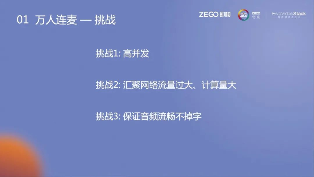 首先万人连麦需要面对高并发的情况,传统的房间不一定可以支持万人连麦所带来的高并发要求。ZEGO 通过改进,现在可以支持单房间 100 万人同时在线。