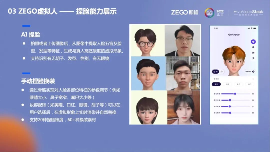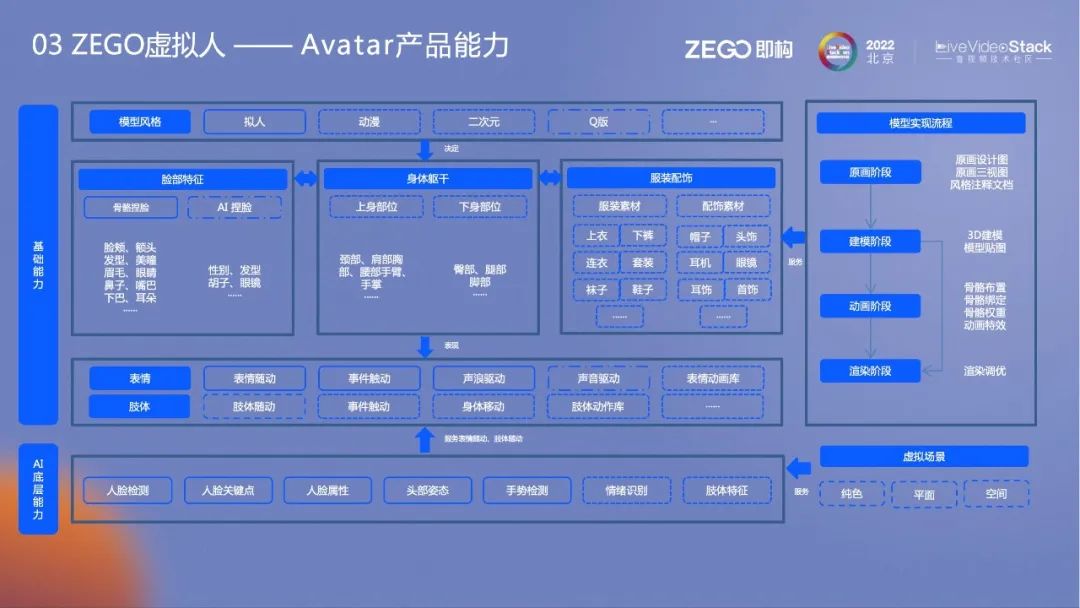 目前由于 AI 的发展,特别是 ChatGPT 应用的快速普及,AI 虚拟人十分常见,那么AI 生成的虚拟人和 ZEGO 的虚拟人有什么区别呢?右边是 ZEGO 虚拟人的生成过程,ZEGO 的虚拟人不是通过 AI 生成的,ZEGO 的虚拟人生成过程比较复杂,需要经过原画阶段的建模、设计、动画、渲染等。原画需要通过原画师自己画,建模我们也有一套自己的建模标准,动画阶段也是。每个环节都有 ZEGO 的设计规范,设计出来的虚拟人是完完整整的人,不是缺胳膊少腿的,同时有配套的衣服、挂件、配件等等,是齐全完备甚至是丰富的。结合ZEGO的设计规范再配套上 ZEGO 的 AI 能力,ZEGO 虚拟人它就像是一个真人一样。总的来说,ZEGO 虚拟人最大的特点是可以通过简单编程实现对虚拟人的精细化控制。