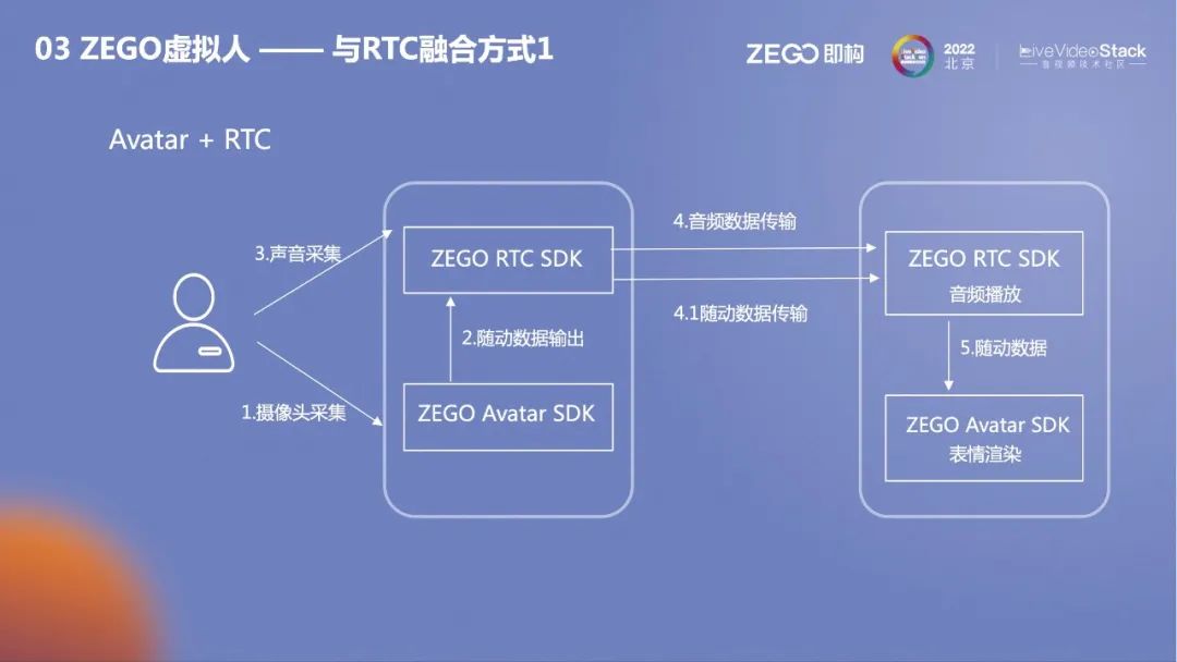 该方案为 Avatar + RTC。Avatar SDK 是 ZEGO 的虚拟人 SDK, Express SDK 是 ZEGO 的RTC SDK。摄像头将采集到的画面传输到 Avatar SDK,Avatar 在得到数据以后,通过 AI 提取面部表情数据,再通过实时渲染的方式将表情渲染出来。画面渲染出来以后,将画面交给Express SDK,经过网络层的传输,Express SDK 采集的音视频信息也会随数据传输,最后Avatar SDK 将数据汇总,输出表情渲染。