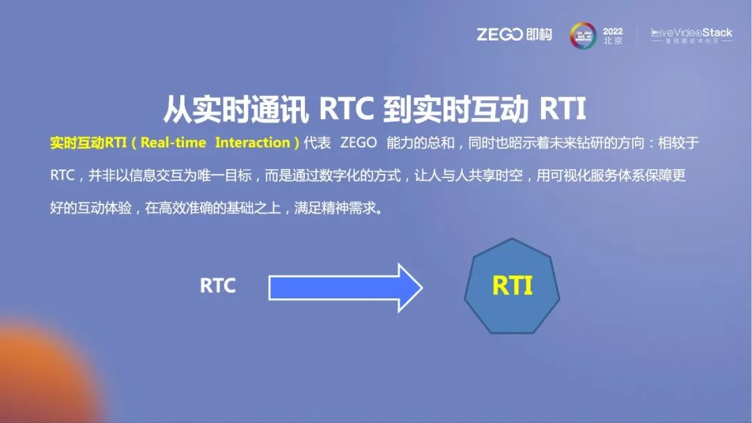 从实时通讯 RTC 到实时互动 RTI,代表着 ZEGO 的产品能力和服务范围也从以往的 RTC 升级到实时互动 RTI。RTI 代表 了ZEGO 能力的总和,同时也昭示着未来钻研的方向——更好的互动体验,满足精神的需求。
