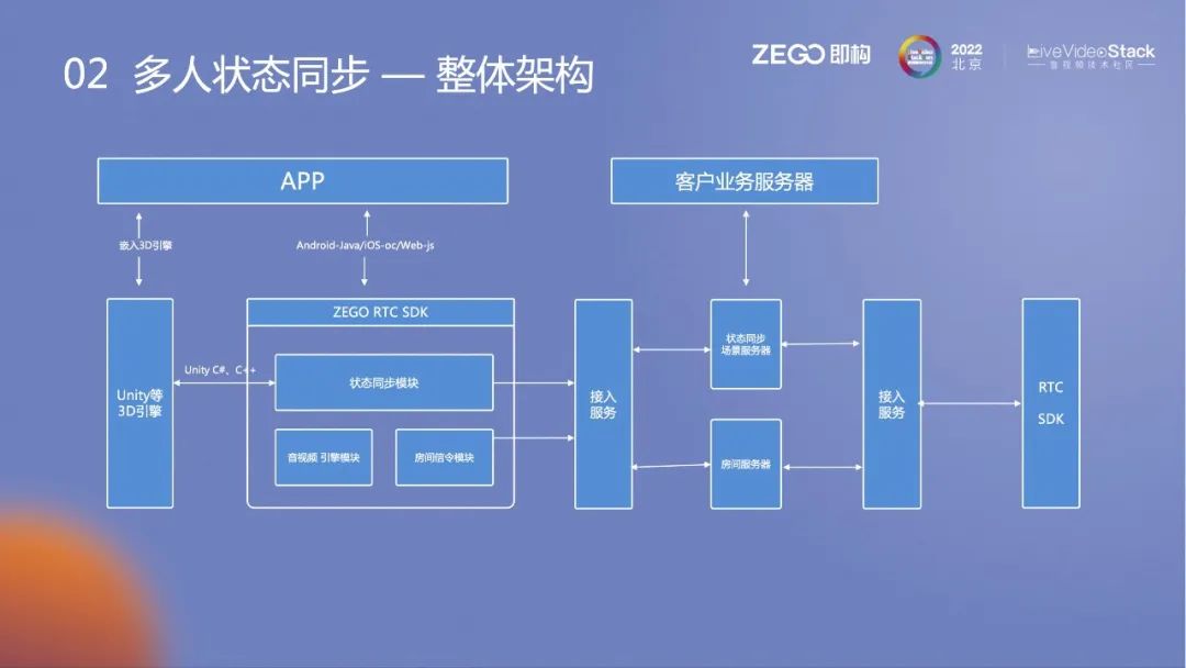 元宇宙场景缺少不了 3D 引擎,通常会使用 Unity 或者 UE 构建。ZEGO SDK 底层以 C 语言进行开发,对外输出接口则为 C++/Unity C#,整体模块支持混合编程构建。3D 虚拟场景开发者或者业务应用 APP 开发者都可以使用各自熟悉的语言进行编程构建,没有额外的学习成本。除了客户端便于集成外,服务端引入状态同步服务器,通过状态同步服务器,业务侧服务器可以订阅所有用户的所有状态信息,以便做业务的其它控制行为。