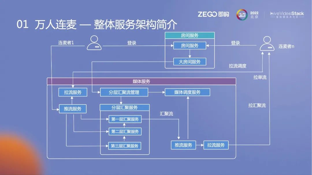 ZEGO 目前设计了三层的汇聚服务,所有的数据最后都会汇聚到推流节点,最后经过调度层出口,经过拉流调度之后,再通过拉流节点拉到汇聚的流,最终实现万人连麦服务。