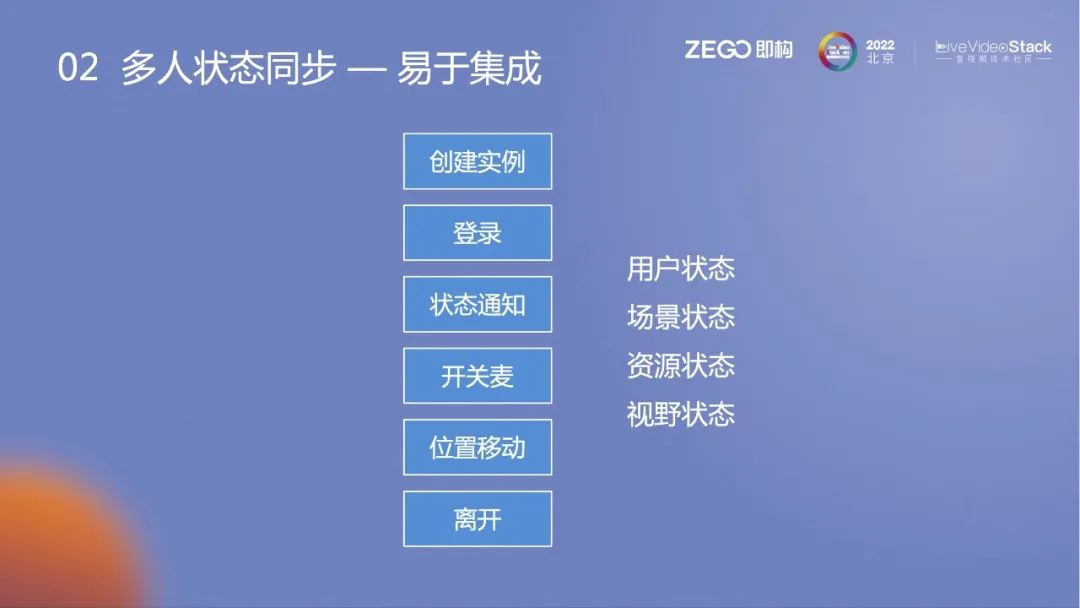 多人实时状态同步,更多的应用在元宇宙场景中。在非元宇宙场景中,用户的状态会少一点,一般会有麦克风状态、摄像头状态等。但是在元宇宙场景中,还会包括移动状态、虚拟人的动作状态、表情状态,物品状态等非常多非常复杂的状态数据。这些状态数据的同步要求也都非常实时,否则没有办法进行良好互动,产品体验也无法满足。现在 ZEGO 可以做到实时信令 60ms 左右的延迟。ZEGO 的状态同步信令之所以能做到 60ms 的信令,是因为 ZEGO 对信令进行全球统一实时监控调度,实时计算边缘节点是否就近接入。