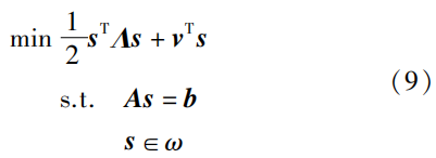 式中,\boldsymbol{H}=\left[\begin{array}{cc} \boldsymbol{A} & \boldsymbol{A}^{\mathrm{T}} \\ -\boldsymbol{A} & \mathbf{0} \end{array}\right] \in \mathbb{R}^{(c+n) \times(c+n)} ;\pmb{u}=\begin{bmatrix} s \\ \lambda \end{bmatrix}\in \mathbb{R}^{c+n} ,\pmb{\lambda}\in \mathbb{R}^c ,为等式约束的拉格朗日乘子;\pmb{r}=\begin{bmatrix} \pmb{-v} \\ \pmb{-b} \end{bmatrix} \in \mathbb{R}^{c+n} ;\pmb{u}\in \Omega ,\Omega=\{\pmb{u}\in \mathbb{R}^{c+n},\pmb{u}^-\le \pmb{u}\le \pmb{u}^+\} ,其中,\pmb{u}^+=\begin{bmatrix} \pmb{s} ^+\\ \pmb{h} \end{bmatrix} \in \mathbb{R}^{c+n} ,\pmb{u}^-=\begin{bmatrix} \pmb{s} ^-\\ -\pmb{h} \end{bmatrix} \in \mathbb{R}^{c+n} ,\pmb{h}\in \mathbb{R}^{c+n} 表示由极大的正数组成的向量。