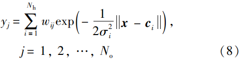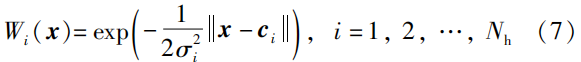 式中,x 为输入样本,c_i 是第i 中心点,\sigma_i 表示基函数第i 个标准差。式(7)构成了FNN的隐藏层空间。因此,其输入向量可以直接映射到隐藏层空间且无需权值连接。RBF神经网络的输出表示为