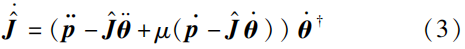 式中,\pmb{\dot{\hat{J}}} 为\pmb{\hat{J}} 的时间导数;\pmb{\ddot{p}} 表示末端执行器的笛卡儿加速度;上标\dagger 表示向量或矩阵的伪逆且\pmb{\dot \theta}^\dagger=\pmb{\dot \theta}^T/(\pmb{\dot \theta}^T\pmb{\dot \theta}) 。当关节速度等于零向量时,\pmb{\dot \theta}^\dagger 会陷入奇异状态。为了避免该问题,奇异状态下的关节速度的伪逆形式被其转置形式所取代。此外,式(3)要求从外部传感器获取末端执行器的笛卡儿速度和加速度的实时信息。文[28]中的理论分析表明,由式(3)生成的误差函数\varepsilon 满足\pmb{\varepsilon}(t)=\pmb{\varepsilon}(0)\text{exp}(-\mu t) 。换言之,误差函数\pmb{\varepsilon} 能通过对\pmb{\hat{J}} 的实时更新全局收敛于零向量。后续的拓展研究基于式(3)开发了意图识别应用和离散学习公式研究,进一步验证了该学习算法的可行性。此后,文[55]提出了一个附带积分项和激活函数的机器人学习公式: