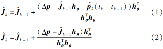 式中,\Delta \pmb{p} =\pmb{p}_k-\pmb{p}_{k-1} ,\pmb{h_{\theta}}=\pmb{\theta}_k-\pmb{\theta}_{k-1} ,下标k 和k-1 表示第k 和k-1 时刻。基于Broyden方法的静态离散时间学习公式(2)相对于动态式(1)去除了速度项\pmb{\dot{p}}_k(t_k-t_{k-1})\pmb{h_\theta}^T 。在跟踪静态目标或极小采样间隔的情况下,式(1)和式(2)的学习性能是类似的。然而,对于动态目标,式(1)能够获得更小的学习误差并取得更好的收敛性能。此外,面向机器人模型不确定的情况,该方法需要传感器获得真实末端执行器的笛卡儿速度\pmb{\dot{p}}_k 来促进雅可比矩阵的学习。基于Broyden方法的机器人学习公式(1)和学习公式(2)多次被应用于处理未标定机器人视觉伺服问题。文[51]基于Broyden方法和测量数据在线估计了视觉雅可比矩阵,进而实现了无模型视觉伺服的任务模式。文[52]针对机器人与未知弹性物体相互作用的问题,提出了一种基于视觉的变形控制器,利用视觉反馈实时估计变形后的雅可比矩阵,避免了繁琐的传统模型辨识步骤。值得注意的是,上述学习公式需要与控制算法进行结合以实现机器人系统的同步学习与控制。虽然Broyden方法在机器人参数估计中是有效的,但是其收敛速度主要取决于机器人的状态且无法调整。