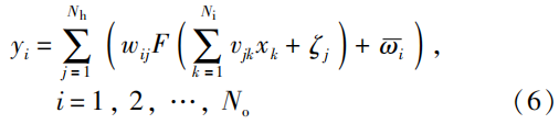 式中,\mathcal{x}_k 和y_i 分别表示神经网络的输入和输出;N_i 、N_h 和N_o 分别表示输入层、隐藏层和输出层的神经元数量;v_{jk} 和w_{ij} 分别表示隐藏层和输出层的权重;\zeta_j 和\bar{\omega}_i 分别表示隐藏层和输出层的偏置项;F(·) 表示隐藏层的激活函数,可以选择为sigmoid激活函数F(\chi)=1/(1+\text{exp}(-\chi)) 。进而,式(6)可以被简化为\pmb{y= A \bar{F}(P\bar{x})} ,式中,\pmb{A} \in \mathbb{R}^{N_o\times(N_h)+1} 和\pmb{P}\in \mathbb{R}^{N_h\times(N_i)+1} 表示两个增广权重矩阵;\pmb{\bar{x}}=[1,x_1,x_2,...,x_{N_i}]^T \in \mathbb{R}^{N_i+1} ;\pmb{y}=[y_1,y_2,...,y_{N_o}]^T \in \mathbb{R}^{N_o} ;