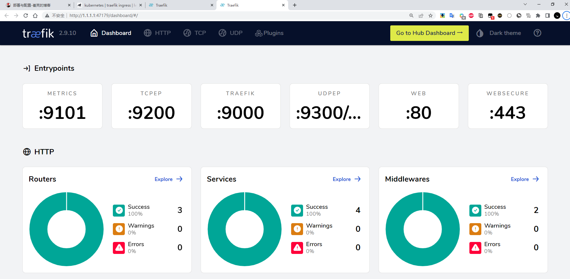 service/traefik NodePort 10.109.10.18 <none> 80:57197/TCP,443:36218/TCP,9000:47179/TCP,9101:25785/TCP,9200:44736/TCP,9300:13220/UDP 2m14s
