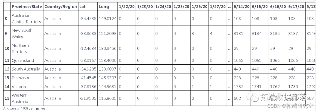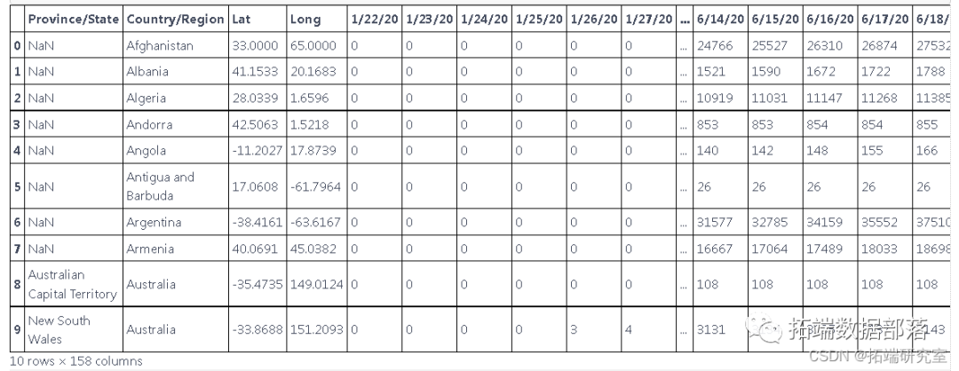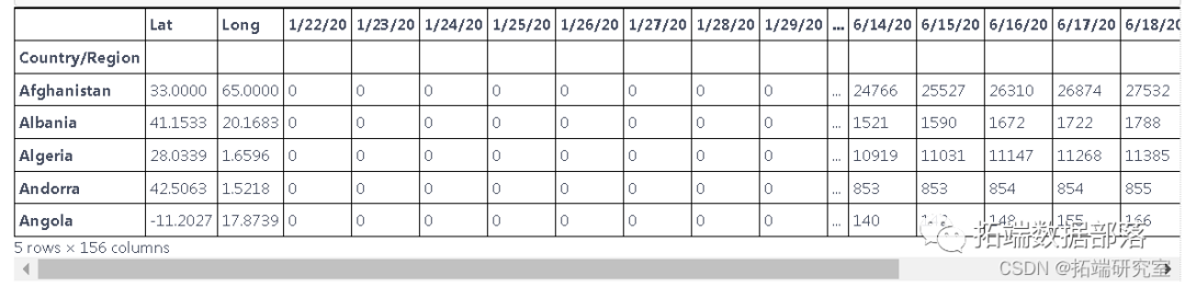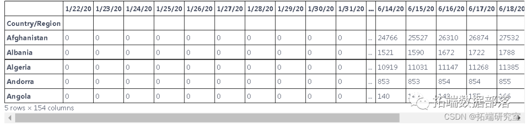 这些数据是根据国家和地区报告新病例的数据,但我们只想预测国家的新病例,因此我们使用 groupby 根据国家对它们进行分组