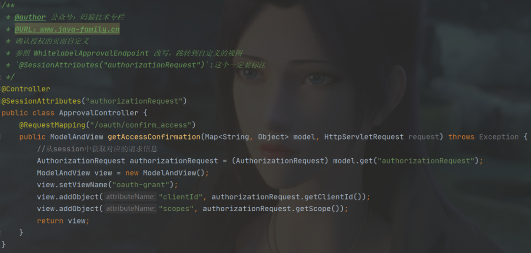 @SessionAttributes("authorizationRequest")这个注解一定要标注,授权请求信息是存储在session中 ”