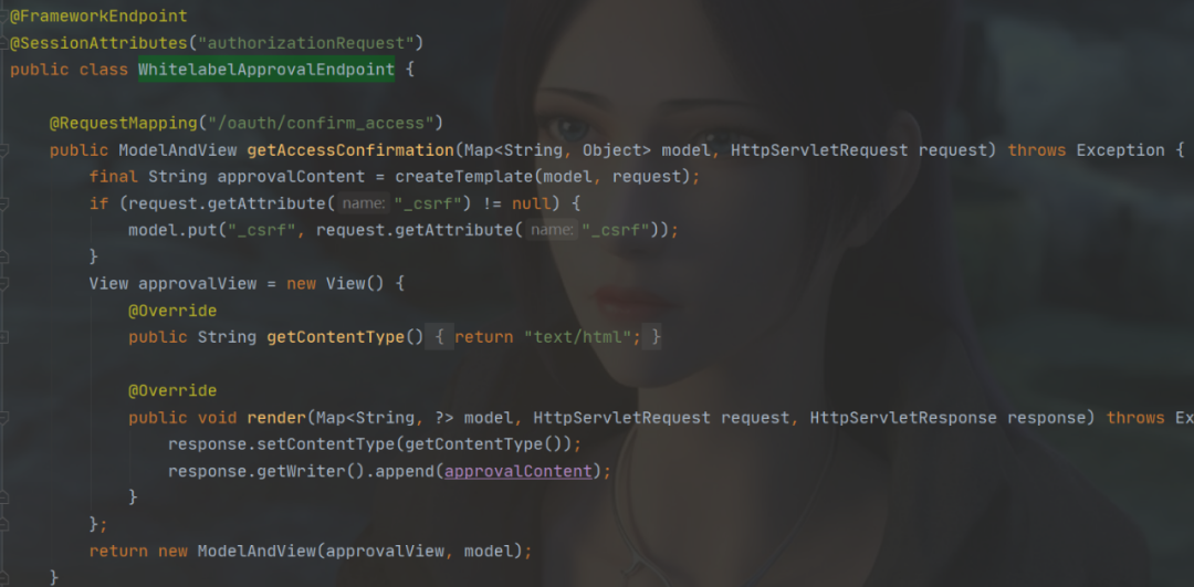 授权页面的跳转接口url:/oauth/confirm_access,这个接口定义在org.springframework.security.oauth2.provider.endpoint.WhitelabelApprovalEndpoint中,如下: