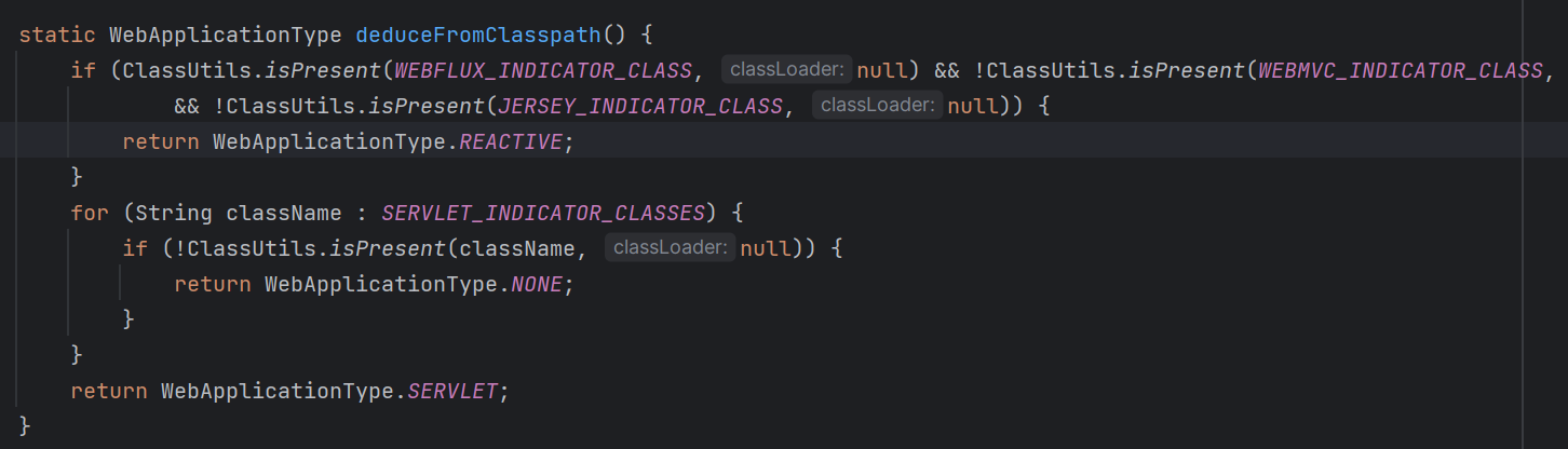 从上述源码来看,我们第一个疑问已经解决了,springboot会根据wepApplicationType的类型来决定创建什么样的ApplicationContext。至于WebApplicationType如何确定,看下WebApplicationType#deduceFromClasspath就可以了,比较简单,比如会根据类路径下是否有javax.servlet.Servlet等来判断web类型是否是SERVLET等等。当我们引入spring-boot-starter-web时,这个引用就会包含对servlet的引用,所以我们创建的就是SERVLET类型的WebApplicationType。