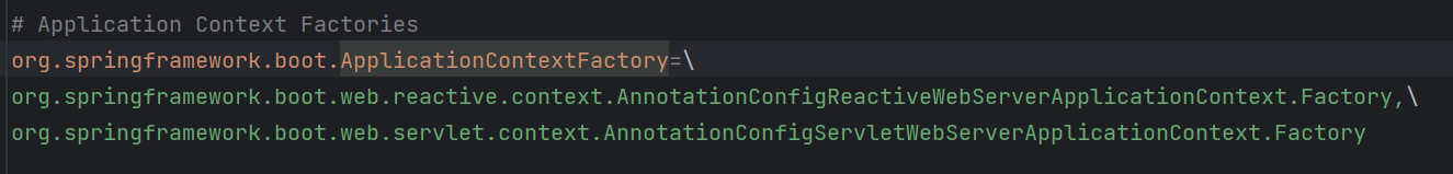 加载其他ApplicationContextFactory来创建Application,如果其他工厂类没有返回结果,就会用默认的AnnotationConfigApplicationContext。SpringFactoriesLoader.loadFactories这个方法有兴趣的可以研究下,这个方法会到spring.factories这个文件里加载你想要的类,spring-boot jar包的spring.factories里定义了如下两个ApplicationContextFactory类,所以这两个类会被加载进来用于创建ApplicationContext。