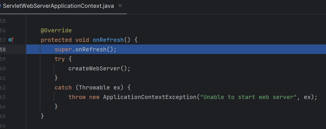 方法内会调用onRefresh()方法,AnnotationConfigServletWebServerApplicationContext就是重写了onRefresh方法,在这个方法里启动了tomcat。