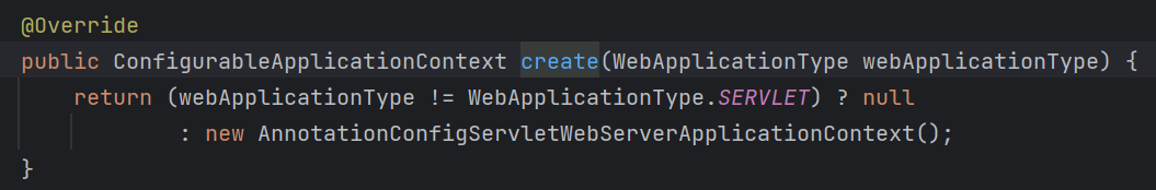 上面两个Factory从名字也能很容易辨别,一个是用来创建ServletWeb应用的,一个是用来创建ReactiveWeb应用的。如下图是AnnotationConfigServletWebServerApplicationContext.Factory的create方法,可以看到如果webApplicationType是SERVLET类型,就会创建AnnotationConfigServletWebServerApplicationContext。