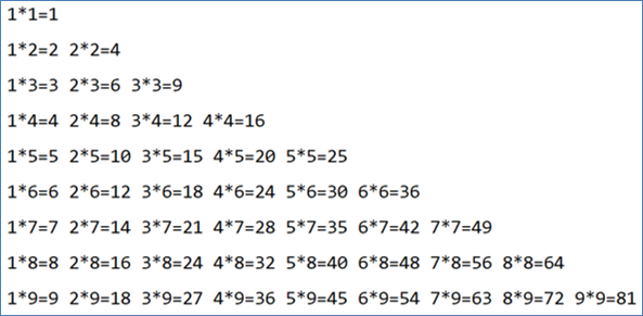 在九九乘法表案例中,我们需要使用print语句,输出不换行的功能,非常简单,实现方式如下: