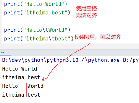 在字符串中,有一个特殊符号:\t,效果等同于在键盘上按下:tab键。 它可以让我们的多行字符串进行对齐。