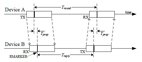 DeviceA 和 DeviceB是两个UWB模块。测距首先由A发起,B收到之后再发回一个相应(Responds),A再接收这个相应,完成一次测距,在A和B每一次发送数据和收到数据的时候。都要记录当前时间戳。这样,通过时间戳相减,就可以得到传输时间差: