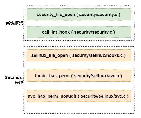 Linux内核提供了一个安全模块框架层,这个公共框架类似于文件系统中的VFS。它为调用者提供统一的接口。之所以要提供统一接口是因为Linux内核不仅仅支持SELinux安全特性,还支持Apparmor等很多安全特性。以打开文件为例,当我们调用内核中打开文件的接口是,在其内部会调用security_file_open函数。该函数就是Linux内核安全框架(LSM)的公共接口。然后该函数通过函数指针的方式调用所有注册到LSM的安全模块。以SELinux为例,最终会调用到selinux_file_open函数。