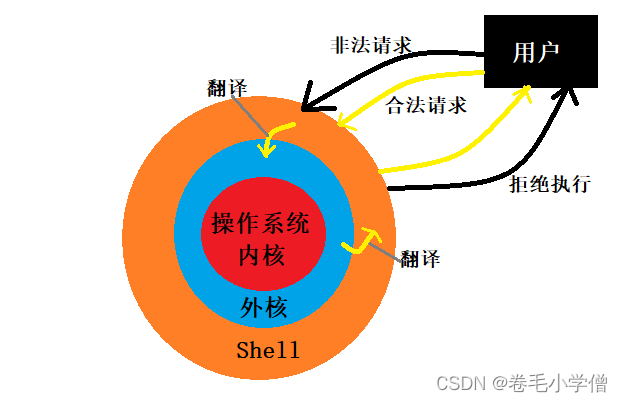 Shell是外壳的统称。 centos 7中的Shell是bash。 Shell是包裹在系统外的一层软件层:
