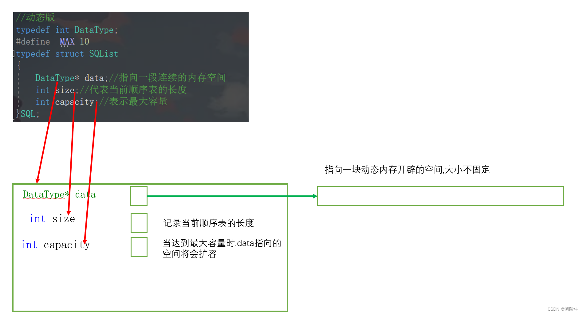 }SQL;动态顺序表虽然容量没有限制,会自动扩容,但是也要设置初始值,当达到初始值的最大限制时,才会去动态扩容.