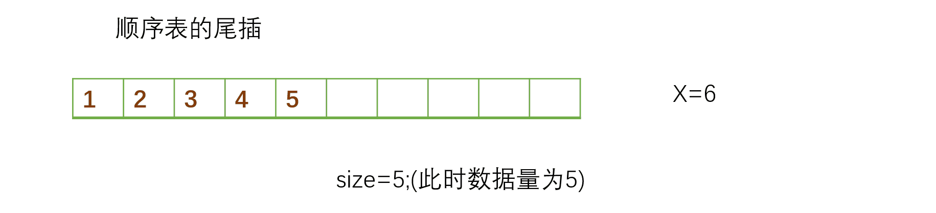 }顺序表的尾插很简单,size为当前顺序表的数据个数,将其作为下标,刚好可以指向新的位置(尾部的下一个位置),将新元素插入后,size自增1,可完成顺序表的尾插操作.