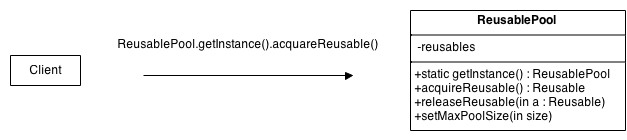 为了达到这个目标, Reusable池类将被设计为一个单例类。其构造器是private修饰的,以强制客户端调用它的 getInstance 方法去获取一个对象实例。