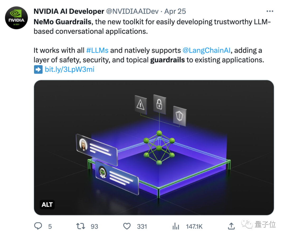这个新工具名叫“护栏技术”(NeMo Guardrails),相当于给大模型加上一堵安全围墙,既能控制它的输出、又能过滤输入它的内容。