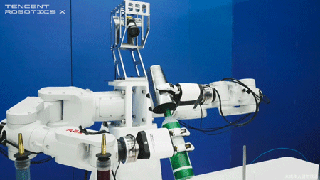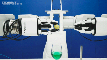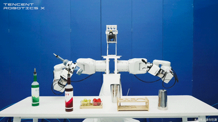 调酒过程中,腾讯Robotics X实验室展示的机器人结合视触觉融合的手内物体姿态估计与基于机械臂末端力传感信号的力位混合控制,实现了酒瓶与摇酒器高速旋转倒酒、大小摇酒器相扣摇酒等双手协同动作。