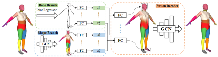 具体来说,作者将人体部件的几何形变解耦为与骨骼相关的变化(比如骨骼长度和方向的变化)和与骨骼无关的变化(比如形状尺寸和风格的变化),它们分别由第k个部位的骨骼隐编码和形状嵌入表示。