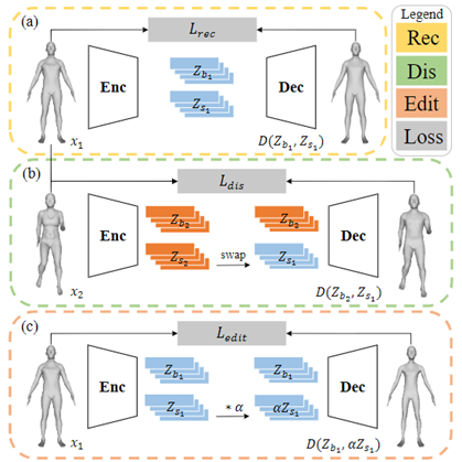 无监督解耦,因此用户可以通过修改输入的关节点位置控制人体部件骨骼的方向和长度,但是对于部件的形状仍然无法实现可控的编辑。为了解决这个问题,作者提出了如图4 (c) 所示的编辑分支,通过监督生成的网格按照期望变形,从而实现部件级别的形状编辑: