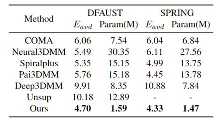 作者首先比较了四类方法来验证该方法的重建精度,分别是基于谱域卷积的方法COMA[3],基于螺旋卷积的方法Neural3DMM[4]和Spiralplus[5],基于注意力的方法Pai3DMM[6]和Deep3DMM[7],以及无监督解耦方法Unsup[8],采用输入网格与重建网格间的平均顶点欧式距离来评价重建精度。