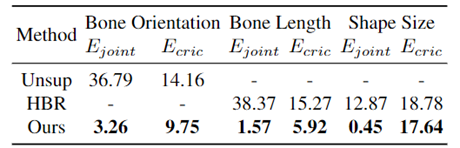作者还展示了该方法在三个编辑任务上的灵活编辑能力:编辑骨骼方向和长度,以及编辑部件形状大小。由于骨骼方向相当于姿势,所以作者在该任务上与无监督姿势和形状解耦工作 Unsup[8]比较;而骨长和形状大小属于形状信息,因此作者在这两项任务上与人体重塑工作HBR[9]进行比较。由于这些编辑任务没有真值,所以作者利用关节点误差Ejoint和周长误差Ecirc来评估编辑骨骼和形状的准确性,其公式如下所示: