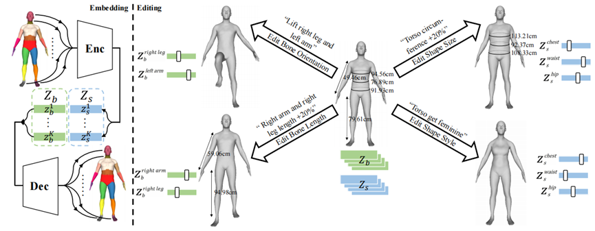 编辑分支:在解耦分支的约束下,网络学习到的隐空间已经实现了人体部件骨骼与形状的